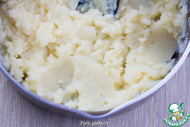 Картофель очистить, отварить, слить почти всю жидкость (я оставляю совсем чуть-чуть на дне) и размять картофелемялкой в густое пюре. Немного охладить. -