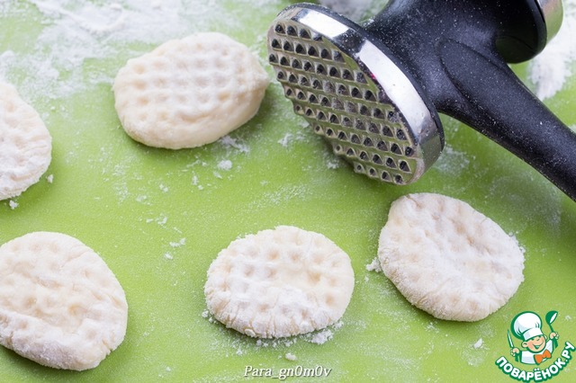 5. Тесто разделить на несколько частей и скатать колбаски диаметром сантиметра 1,5-2, не больше. Немного подпылив рабочую поверхность мукой, нарезать колбаски на кусочки около 2 см. Каждый кусочек придавить вилкой или молотком для разделки мяса, придавая ему овальную форму и создавая бороздки. В Италии для создания бороздок используют специальную доску. Бороздки имеют не только декоративное значение, они помогают соусу лучше обволакивать и пропитывать ньокки. Ньокки выложить на доску или другую ровную поверхность и чуть подморозить. Можно этого не делать, но, на мой взгляд, так они лучше сохраняют форму. Неиспользованные ньокки заморозить и сложить в пакет, убрать в морозильную камеру для хранения.