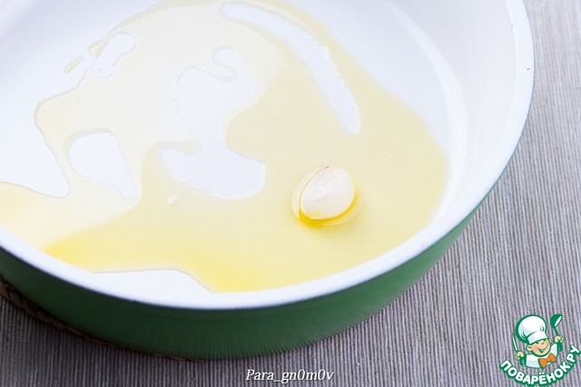 6. Креветки разморозить (у меня уже вареные). Если свежие, то отварить согласно инструкции на упаковке. Креветки очистить от панциря, оставить четыре штуки для украшения. На сковороде разогреть оливковое масло и спассеровать зубчик чеснока до появления характерного запаха.