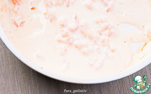 8. Добавить креветки и сливки, тушить все вместе около 2 минут.