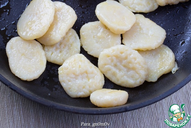 10. Вскипятить достаточное количество воды, подсолить. Если отвариваете сразу все ньокки, то лучше приготовить две кастрюли и варить небольшими партиями. Отварить ньокки до готовности (примерно 2 минуты после всплытия). В сковороде разогреть сливочное масло. Вынуть отварные ньокки шумовкой и обжарить около минуты в сливочном масле.