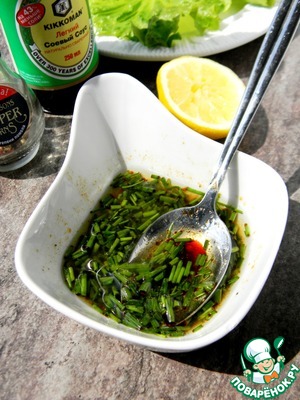 Для маринада в миске смешать мелко нарезанный зеленый лук, соевый соус, масло и сок лимона, поперчить и перемешать.