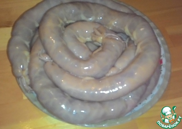 Набиваю мясо в кишку. Кишка мне попалась узкая, обычно она толще, но и так сойдет, потому как готовлю для повседневного употребления, для детей.