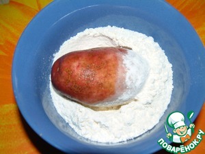 Тщательно моем картошечку, не чистим, готовим в мундире. Прокалываем в 1-2 местах вилкой, чтобы не лопнула при запекании. Смешиваем муку с солью. Обваливаем в муке картофель и ставим его в микроволновку на 10 минут.