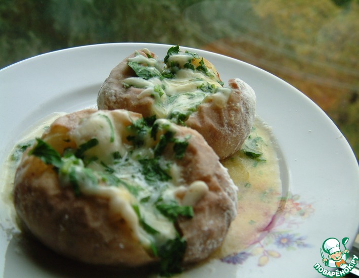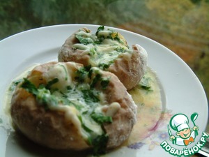 Пока готовится картофель, разминаем вилкой сливочное масло, тёртый сыр, порубленную зелень. Когда картофель готов, разрываем его 2-я вилками на 2-3 части, но не дорываем кожицу до конца. Кладём в картошку нашу начинку, да побольше. И ставим ещё на минуточку в микроволновку.