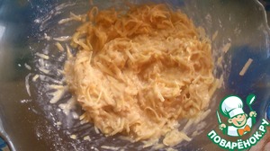 Картофель трем на терке как на дранники. отжимаем влагу. добавляем два яйца, перемешиваем, затем добавляем муку и соль. все хорошо перемешиваем. тесто готово.