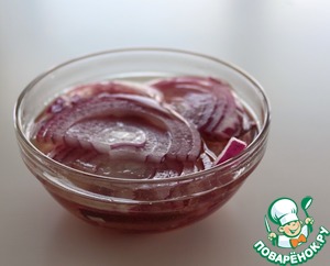 Замариновать нарезанный лук в смеси 4 ст. л винного уксуса, 4 ст. л растительного масла, 1/2 ч. л сахара, соли