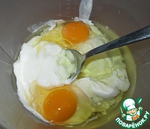 Растительное масло, яйца, сметану, ванилин выложить в посуду, в которой будем замешивать тесто.