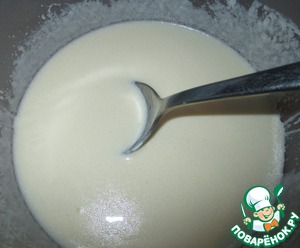Всыпать мелкий сахар, просеянную муку. Размешать, чтобы не было комочков. Всыпать соду, погасить её уксусом. Перемешать и дать постоять минут 5.