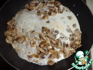 Грибы чистим, нарезаем не крупно и отправляем на сковороду, обжариваем на сильном огне. Добавляем сливки, убавляем огонь и немного потомим. -