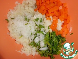 Добавляем к картофелю морковь, нарезанную кубиком, мелко нарезанный лук (чем мельче, тем лучше), зелень.