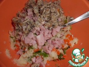 Следом отправляем ветчину и грибы.