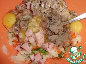 За это время картофель наш немного остыл, можем вводить яйца. Солим и перчим по вкусу. Тщательно размешиваем.
