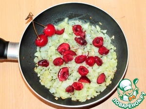К слегка тушеному луку добавляем нарезанную вишню,