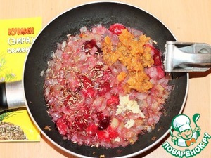 пасту из изюма, перец молотый, выдавленные 2 зубчика чеснока, кумин