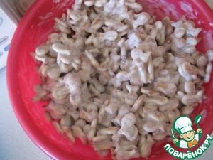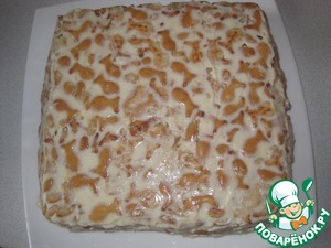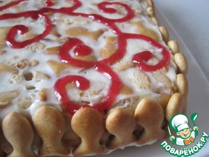 Боковые стороны обклеиваем крекером. Он хорошо прилипает к влажному торту и украшаем джемом.