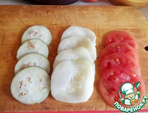Нарезать баклажан, кабачок и помидор тонкими слайсами и подсолить.
