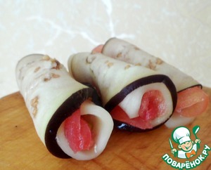Сложить слайсы баклажана, кабачка и помидор друг на друга и свернуть рулетом.