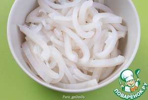 1. Кальмары промыть. Если кальмары неочищенные, то удалить внутренности, хитиновую пластину, еще раз промыть. Опустить на 30 секунд в кипящую воду, снять с огня и дать им немного остыть в этой воде (в идеале до комнатной температуры, но не обязательно). Слить воду и очистить (если кальмары неочищенные) свернувшуюся пленку. Нарезать кальмары полосками шириной около 0,5 см.