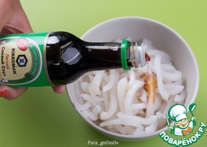 3. Добавить к кальмарам соевый соус и оставить мариноваться минут на 5. Для морепродуктов я всегда использую именно легкий соевый соус, на мой взгляд он достаточно хорошо подчеркивает их нежный вкус, но не перебивает его.