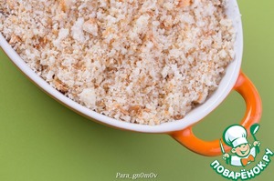 2. Приготовить хлебные крошки. Батон (лучше вчерашний) натереть на терке. Выложить крошки ровным слоем на противень или в форму для запекания, слегка (!) сбрызнуть оливковым маслом. Духовку нагреть до 200 градусов и запечь крошки под грилем до легкой румяности. Следить, чтобы крошки не подгорели, они готовятся очень быстро, около 4-5 минут.