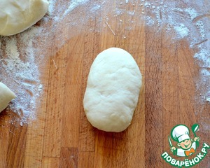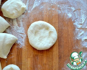 Выложите его на рабочую поверхность, слегка припыленную мукой и разделите на колобки, весом примерно 70 г каждый. Каждый колобок нужно слегка расплющить ладонью в лепешку.