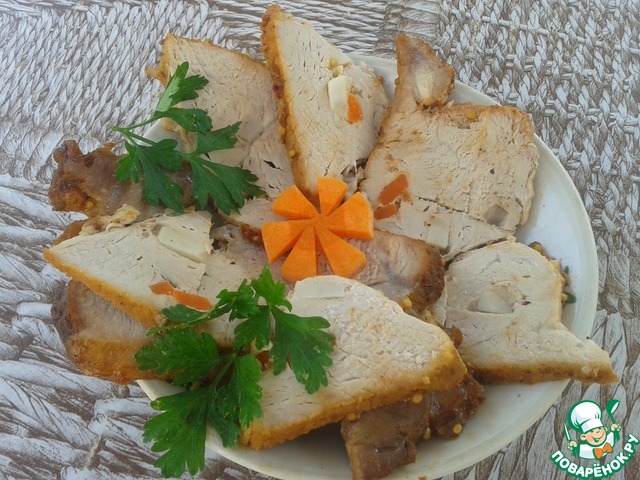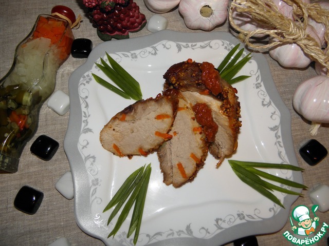 Чеснок и морковь мелко нарезать, делать проколы в мясе и поочередно нашинковывать свинину чесноком и морковью.
