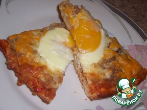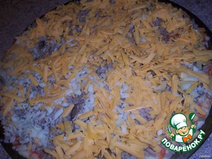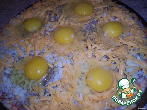 сверху посыпать сыром, взять стакан и донышком сделать углубления, чтоб можно было выбить туда яйца.