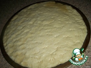 потом смазать руки маслом и форму для пиццы тоже, руками распределить тесто, проколоть вилкой, кругом.
