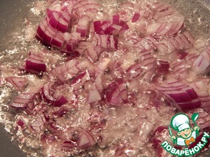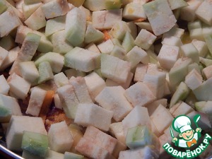 Добавить, порезанный кубиками баклажан. Обжаривать минут 5.