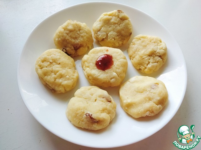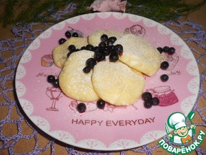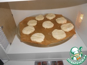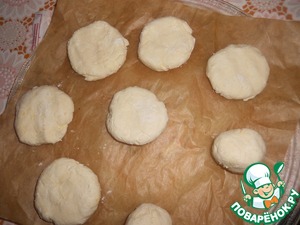 Выложить творожные шарики на пергамент, расплюшить творожные шарики (т. е. сформовать сырники).