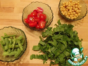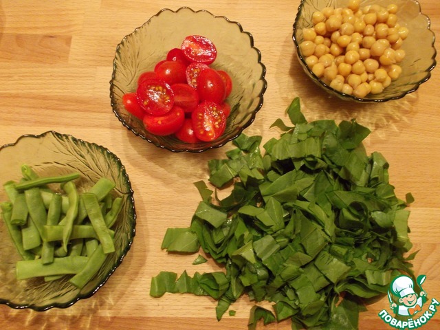 Стручковую фасоль нарезать небольшими кусочками, черри - половинками, щавель нашинковать, из нута слить жидкость.