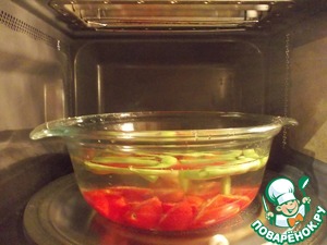 В стеклянную форму для СВЧ положить фасоль и помидоры, залить 1,5 литрами холодной воды.
