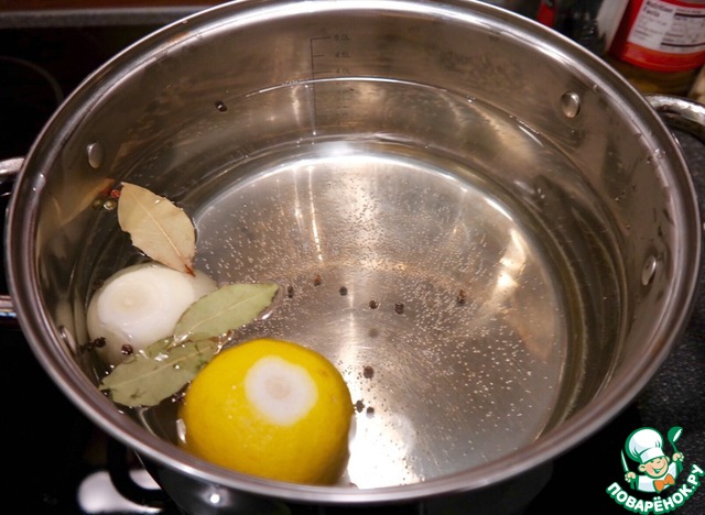 Ставим большую кастрюлю с водой на огонь. Туда же целый лимон, лавровый лист, перец горошком, очищенную одну луковицу и.. винную пробку! НАДААА!!! Она на фото от стыда и ужаса под луковицу спряталась, крича в голос "шо я тут забыла, люди добрые!!!" Типа у пробки выбор был.. А я то начиталась, что от нее осьминог мягкий. Кстати, забегая вперед, получился реально мягкий. Как сказал муж: точно-точно, дело ж пробке!))) Даем закипеть. НЕ СОЛИМ!