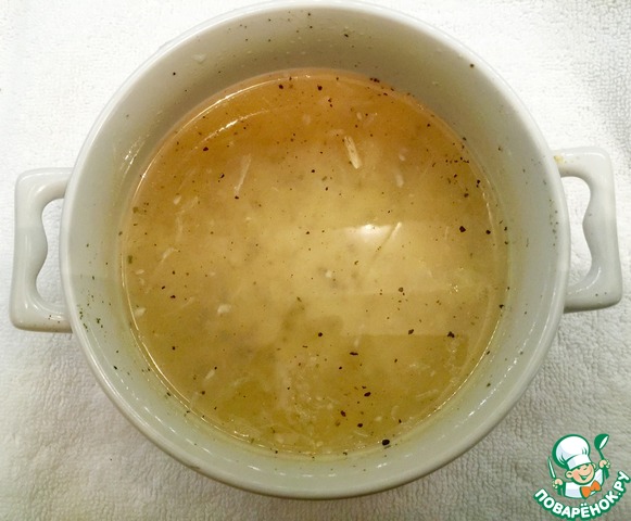 Теперь берем емкость и в нее наливаем уксус, сок одного лимона, чеснок через пресс и свежемолотый перец. Даем постоять минут 5.