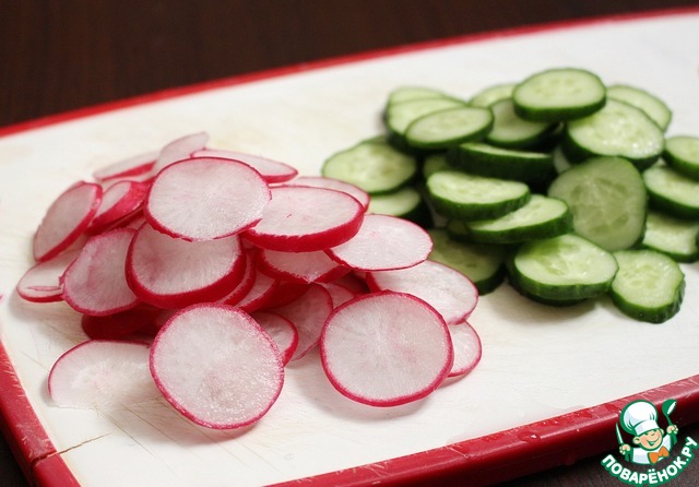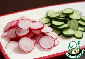 Огурец и редис нарезать тонкими кружочками.