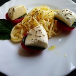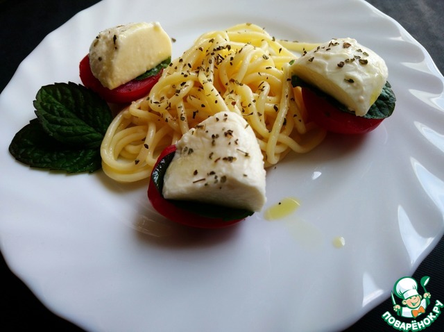 • С помидор срезаем верхушку, ставим на тарелку, обливаем заправкой. На помидор кладём лист базилика, на базилик -моцареллу. На одну порцию я сделала 3 шт. В центр выкладываем спагетти. Поливаем всё оставшейся заправкой и присыпаем порубленным базиликом.