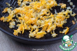 2. Одновременно очистить и мелко нарезать лук, морковь натереть на крупной терке. На половине сливочного масла обжарить лук и морковь до золотистого цвета.