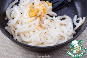 3. Кальмары на 30 секунд опустить в кипящую воду, очистить от свернувшейся пленки. Нарезать полосками толщиной около 0,5 см. Добавить к луку и моркови, обжарить около минуты.