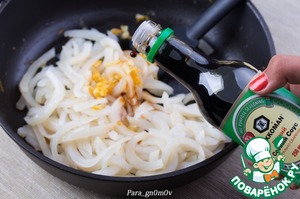 4. Добавить соевый соус, все перемешать. Для морепродуктов мне нравится использовать именно легкий соевый соус, он не перебивает, а только подчеркивает нежный вкус морепродуктов.