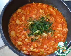 Добавить мякоть томатов в собственном соку. Влить 0,5 стакана воды. Посолить, поперчить по вкусу и добавить 0.5 ч. л. сахара (это позволит слегка нейтрализовать кислоту от томатов). Накрыть сковороду крышкой и тушить соус около 15 минут на небольшом огне, пару раз перемешать.