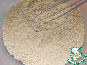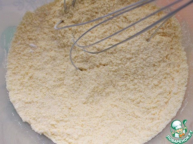 Смешать кукурузную муку, разрыхлитель и сахар.