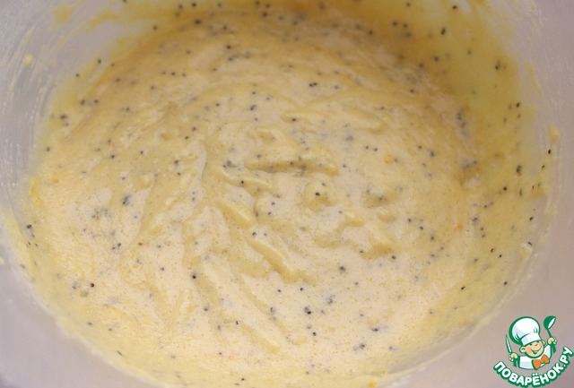 К сухим ингредиентам добавить жидкие, вмешать мак и лимонную цедру. (Если мак у Вас хорошего качества и не горчит, сразу добавляйте его в тесто. В противном случае мак следует залить кипятком и дать настояться под крышкой минут 7. Затем процедить через сито.) Тесто разлить по формочкам, заполняя их не более чем на 2/3. Готовить при 1000 Вт 1 минуту. Дать остыть.