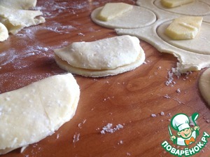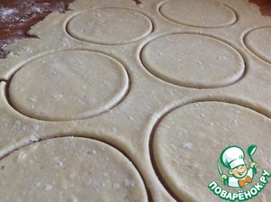 Тесто вынуть из холодильника и раскатать в пласт, толщиной около 3 мм. Вырезать стаканом или формочкой кружочки.