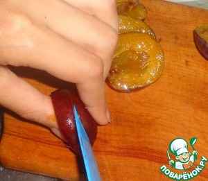 Сливы промыть водой, удалить косточки. С каждой половинки сливы срезать нижнюю часть со шкуркой, чтобы сливовый сок проник в кашу.