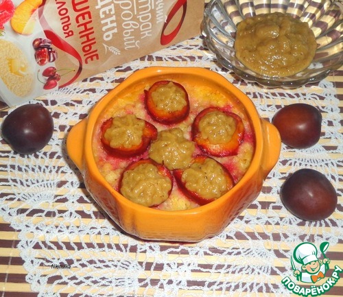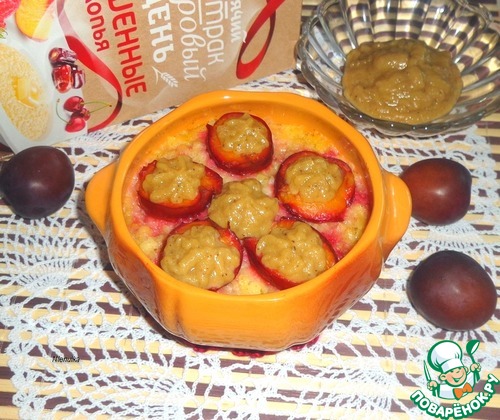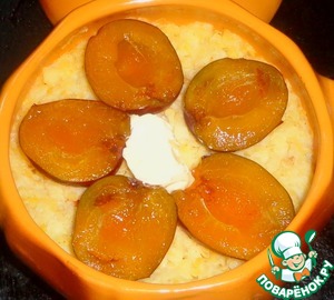 Достаем кашу из духовки, раскладываем сливы, по вкусу кладем сверху сливочное масло и ставим еще на 5-7 минут.