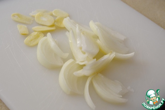 Итак, режем чеснок тонкими пластинами, лук - тонкими полукольцами. -