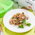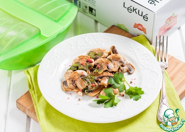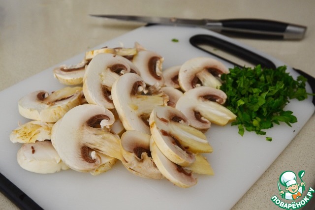 Шампиньоны также нарезаем тонкими пластинами. Петрушку мелко шинкуем.