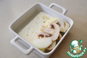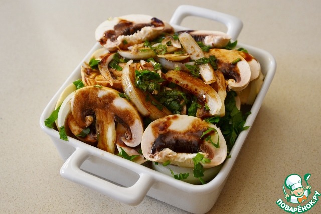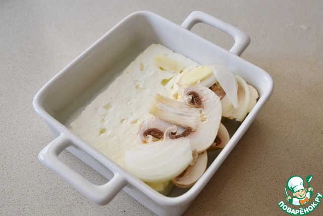 На фету выкладываем лук, чеснок, шампиньоны и петрушку.
