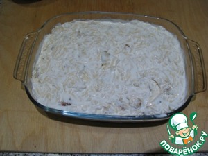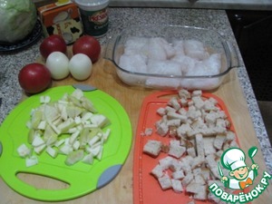 Треску промываем под проточной водой, режем на порционные куски и обсушиваем бумажным полотенцем. Выкладываем первым слоем в жаропрочную форму.